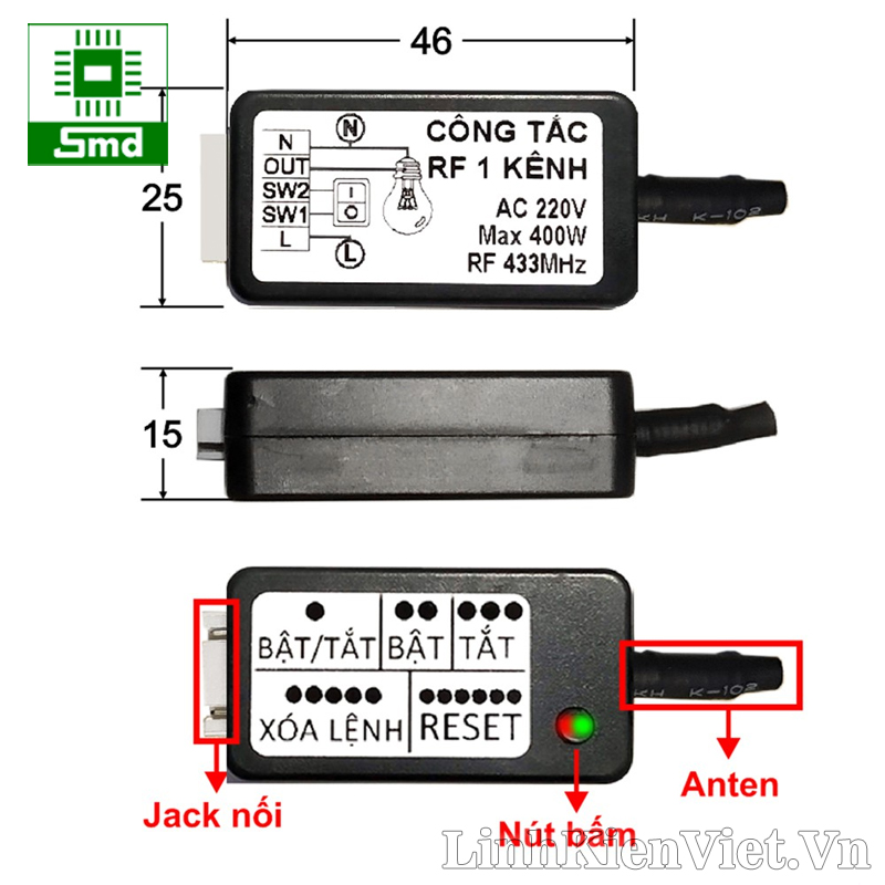 Bộ điều khiển thiết bị 1 kênh RF 433 220V được nghiên cứu và phát triển bởi Linh kiện Việt với kích thước rất nhỏ gọn và tính năng được thiết kế phù hợp để triển khai nhà thông minh hoạt động song hành với hệ thống điện hiện tại.