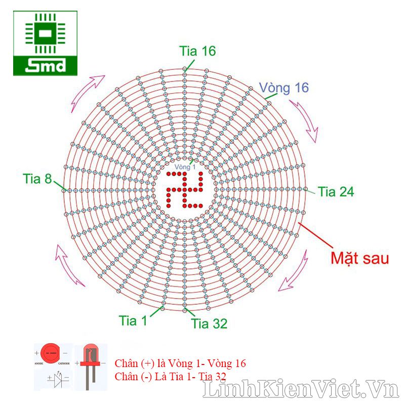 Số LED điều khiển: 16 vòng x 32 tia (512 LEDs)