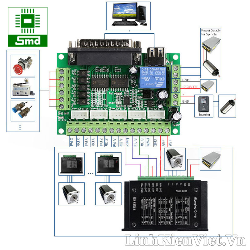Module MACH3 5 trục dùng để nhận dữ liệu từ cổng giao tiếp song song LPT của máy tính để nhận lệnh và điều khiển các cơ cấu chấp hành khác như đọc dữ liệu từ cảm biến, xuất xung điều khiển động cơ, kích relay bơm nước,…