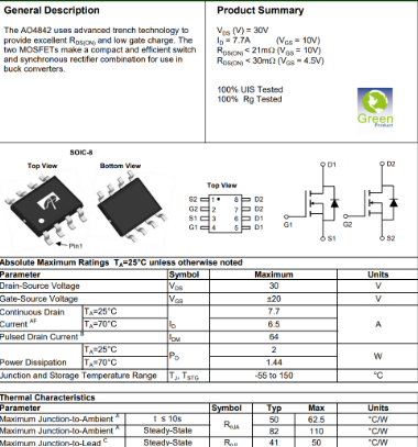 - AO4842 Dual N-Channel 7.7A - 30V 21 miliom SOP-8