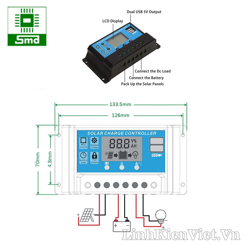 - Bộ điều khiển sạc pin mặt trời 12V/24V 30A có USB được thiết kế nhỏ gọn và cách sử dụng đơn giản với các hình ảnh hướng dẫn được in sẵn trên mặt sản phẩm. Ngoài ra sản phẩm còn được trang bị 2 ngõ ra cổng USB hỗ trợ sạc điện thoại,...