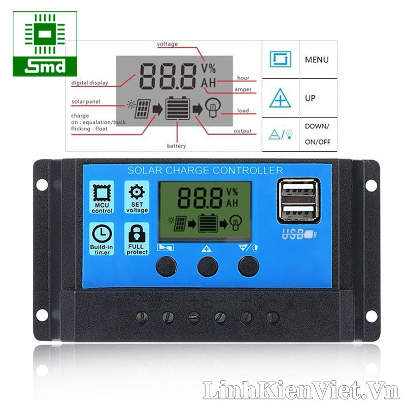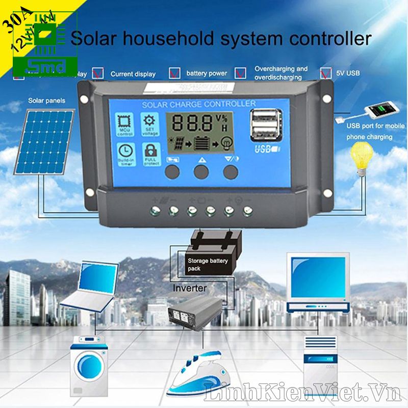 - Bộ điều khiển sạc pin mặt trời 12V/24V 30A có USB được sử dụng điều khiển điện áp thu được từ pin mặt trời luôn ổn định để sạc cho Ắc Quy 12V hoặc 24V với công suất tải lên đến 360W cho điện áp 12V và 720W cho điện áp 24V.