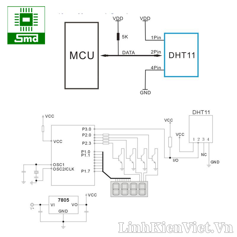- Cảm biến nhiệt độ - độ ẩm (DHT11) là cảm biến thông dụng tích hợp vừa đo được nhiệt độ và độ ẩm, độ chính xác khá cao. Giao tiếp với vi điều khiển qua chuẩn giao tiếp 1 dây.