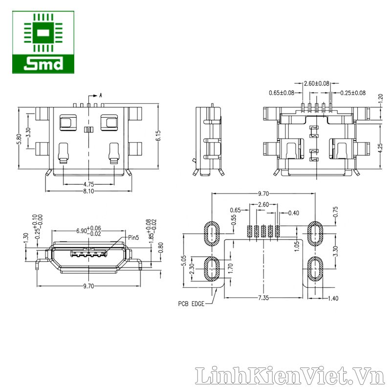 - Chân micro USB cái SMD 0.8 5P (chân định vị cắm)