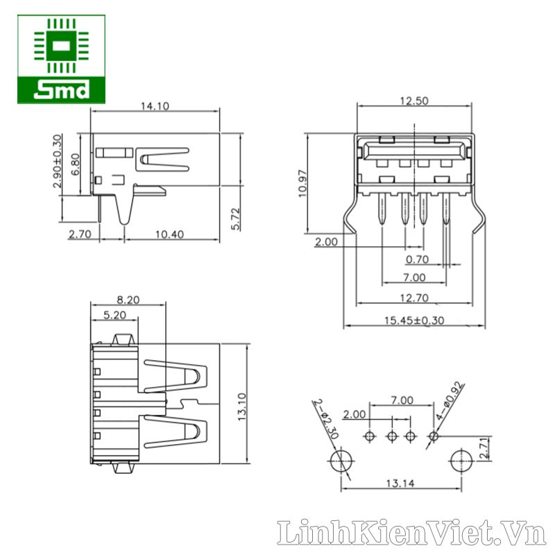 - 1x Chân USB type A cái DIP cong