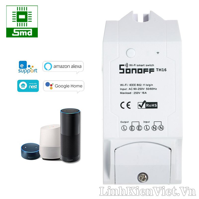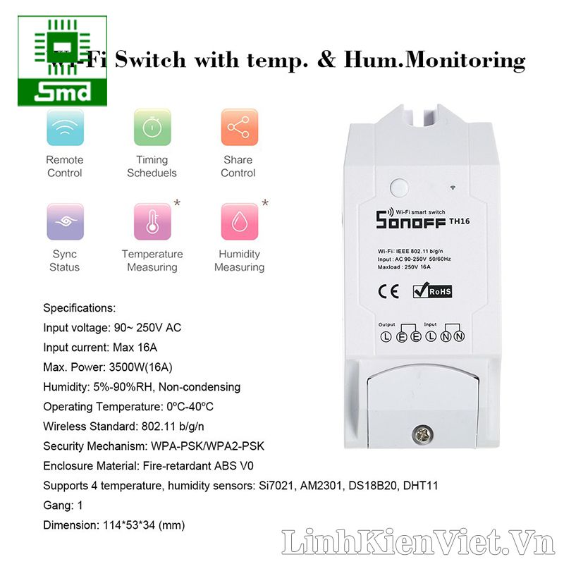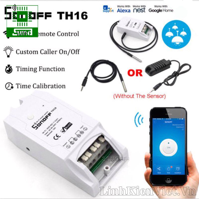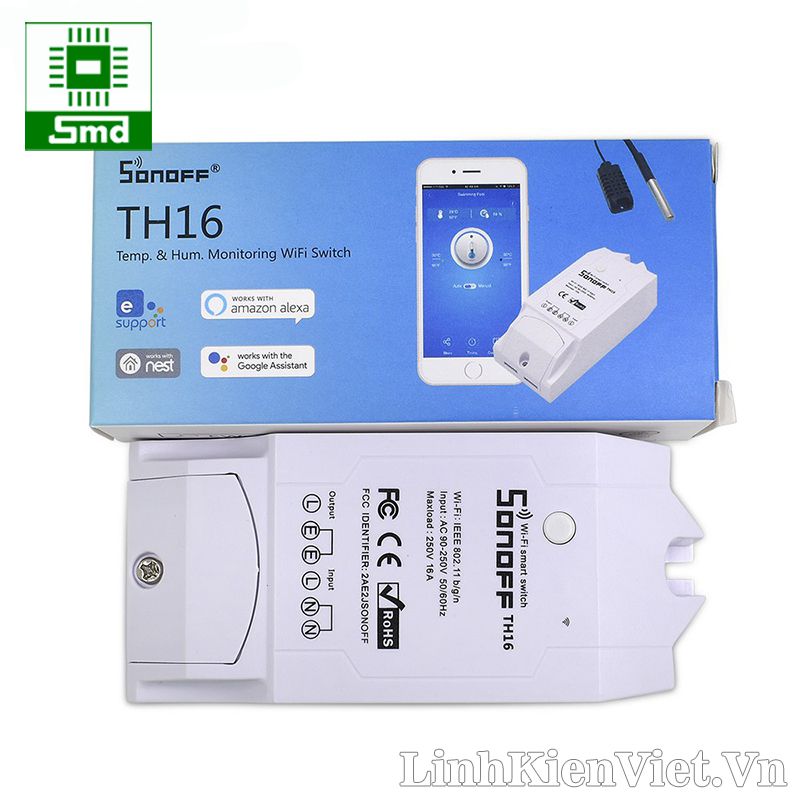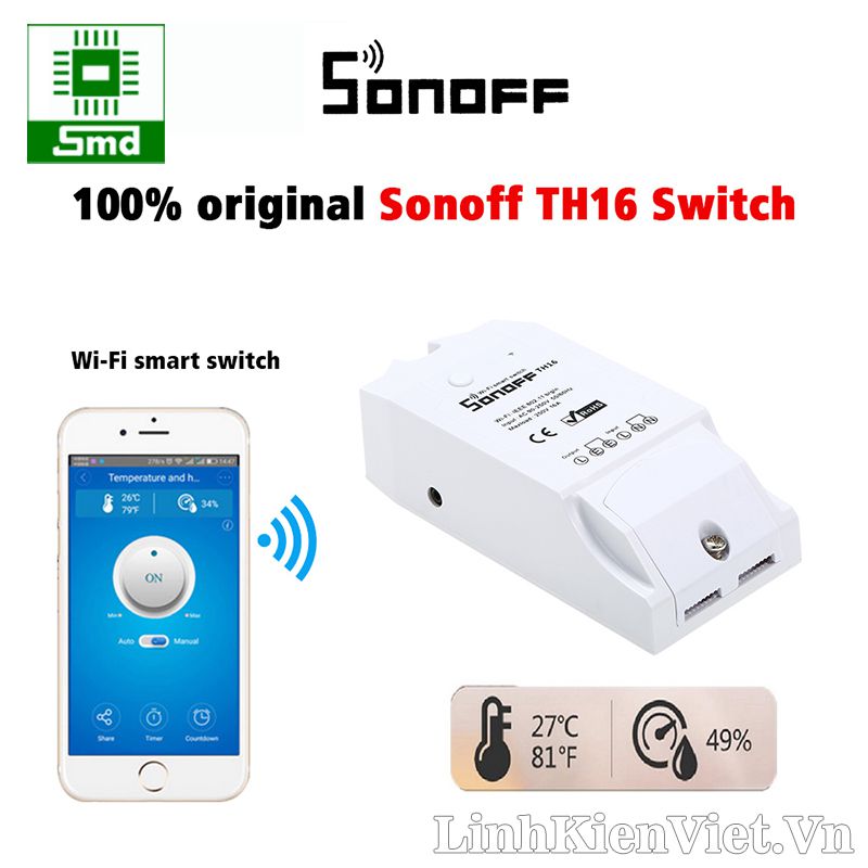 - Công tắc điều khiển từ xa Wifi Smart Switch Sonoff TH16 có khả năng đóng ngắt tải tối đa lên đến 16A, ngoài ra nó còn có khả năng kết nối với cảm biến nhiệt độ, độ ẩm để truyền về phần mềm, dựa vào các thông số nhiệt độ độ ẩm trên phần mềm theo dõi để thiết đặt các cơ chế đóng ngắt công tắc qua nhiệt độ và độ ẩm, thích hợp cho các ứng dụng điều khiển từ xa qua internet, IoT,...