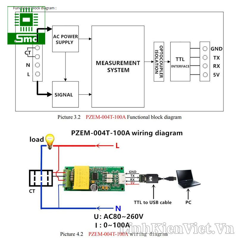 - Dòng điện đo và hoạt động: 0 ~ 100A, sai số 0.01