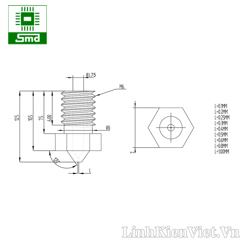 Đầu phun máy in 3D M6 0.3/1.75mm