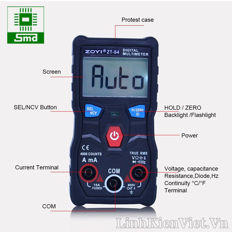 Đồng hồ ZT-S4 với các chức năng cơ bản như điện áp, điện trở, thông mạch, NCV và được trang bị thêm rất nhiều tính năng mới: Đo tụ điện, đo tần số, đo nhiệt độ, kiểm tra LED, kiểm tra diode