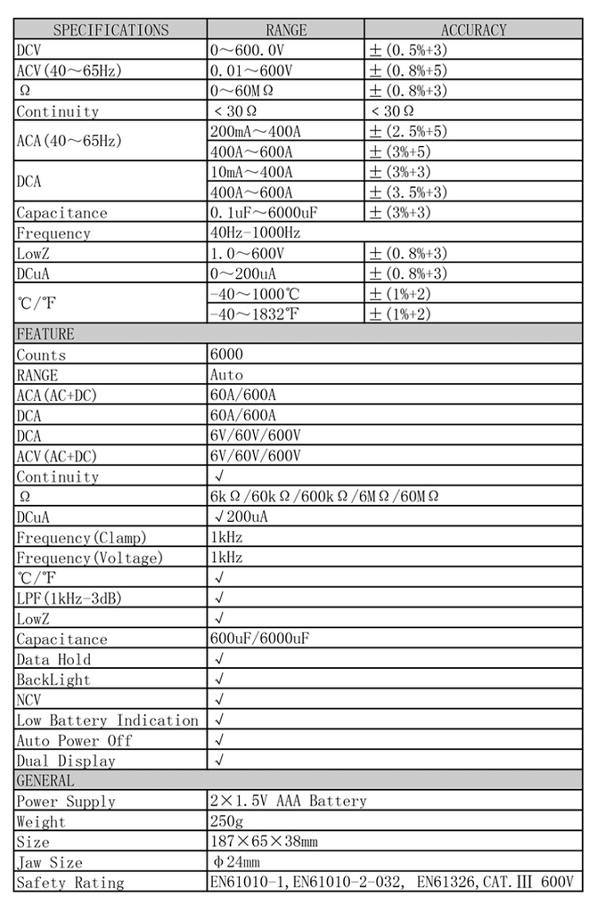 - Phát hiện điện áp không tiếp xúc NCV, kích hoạt nhanh tại mọi thang đo.