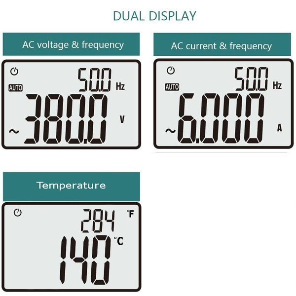 - Màn hình LCD kép với số đếm 6000 counts hiển thị đo dữ liệu rõ ràng nhanh chóng. Hiển thị 2 thông số cùng lúc (Điện áp - tần số,...)