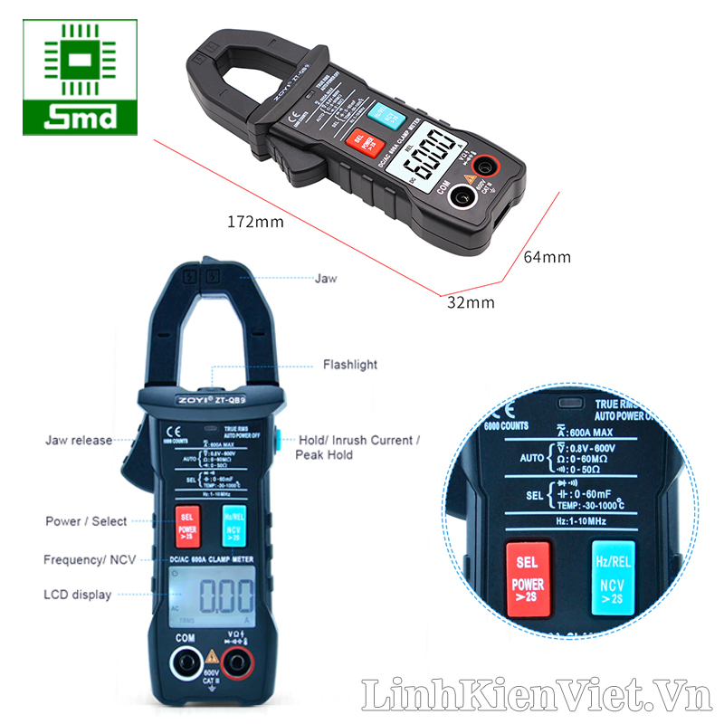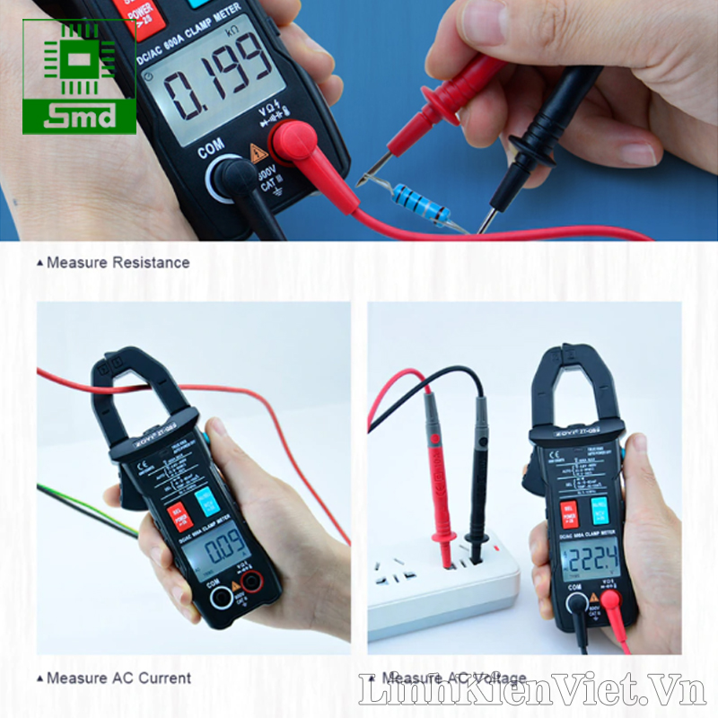 - Đầy đủ chức năng: Đo dòng AC và DC 600A, Đo điện áp AC/DC, điện trở, tụ điện, diode/led, thông mạch, tần số, NCV