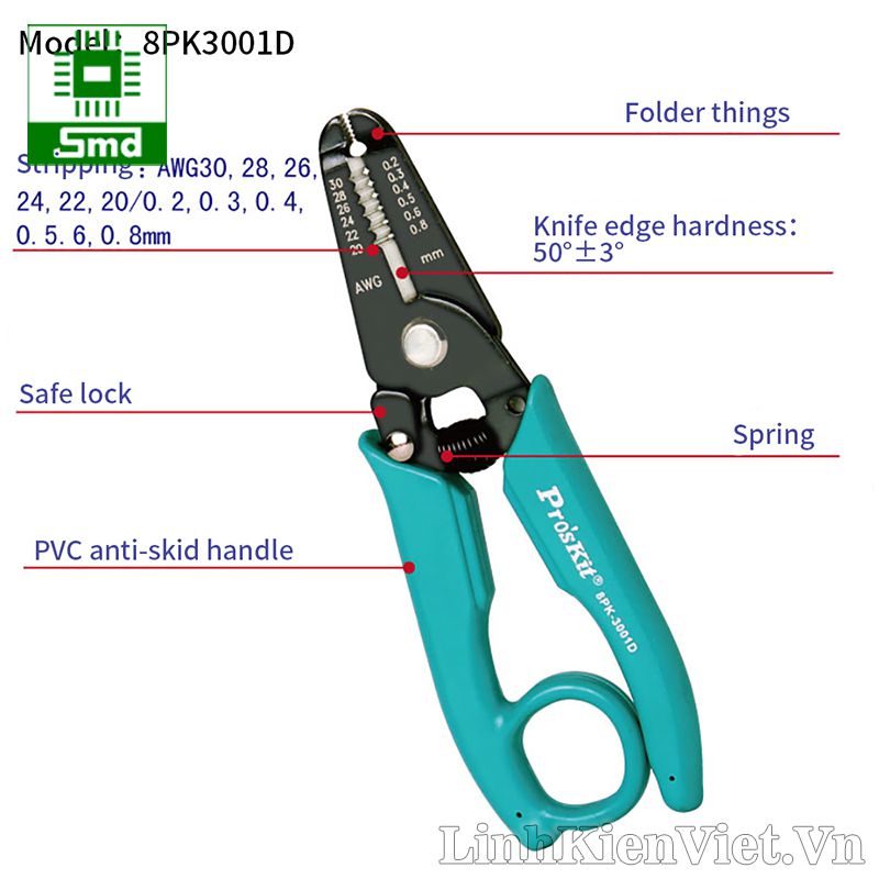 - Kìm tuốt dây , cắt dây đa năng Pro'skit 8PK-3001D (Proskit 8PK 3001D) Ø 0.2mm - 0.8mm