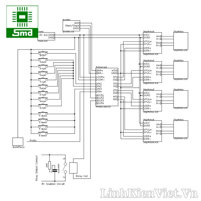 Mạch điều khiển máy cnc 4 trục USB có khả năng điều khiển 4 động cơ bước cùng lúc qua các ngõ cấp xung-chiều X, Y, Z, A, mạch còn có khả năng nhận các ngõ vào tín hiệu IN1, IN2, IN3, IN4, và xuất tín hiệu qua các ngõ ra OUT1, OUT2, OUT3, OUT4, các ngõ tín hiệu vào ra này điều được cách ly qua Opto và IC đệm nên rất an toàn cho board mạch.