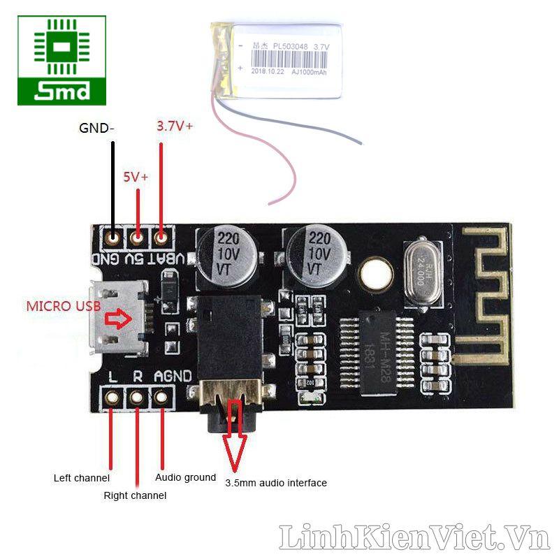 Sản phẩm có chức năng nhận tín hiệu từ thiết bị phát như điện thoại, máy tính,.. rồi xuất ra tín hiệu âm thanh cho tai nghe hoặc amply qua jack 3.5mm hoặc các chân hàn.