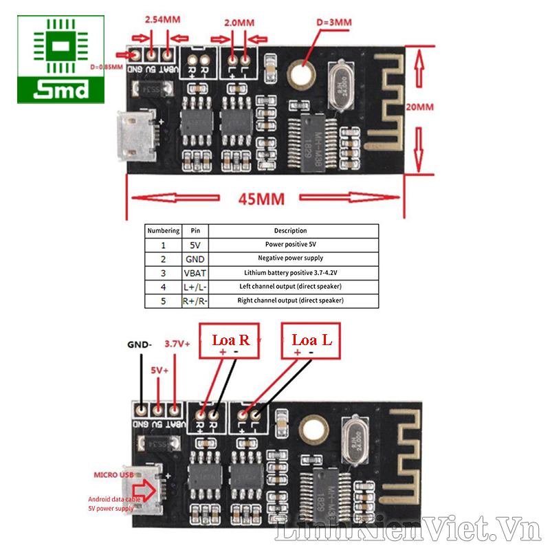 Nguồn cấp: MICRO USB 5V hoặc pin lithium 3.7V