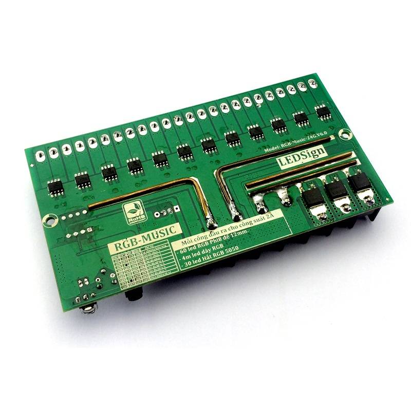Mạch nháy theo nhạc RGB 24 cổng có 9 hiệu ứng nháy cực bắt mắt được chọn bở nút nhấn, hiệu ứng đổi màu trên từng led tạo hiệu ứng led full nhưng sử dụng led RGB giá rẻ. Số hàng led cũng có thể được tùy chọn từ 8-24 phù hợp với mọi yêu cầu của khách hàng trong ứng dụng trang trí phòng nhạc, trang trí phòng karaoke. Sản phẩm được cung cấp bởi linh kiện điện tử SMD