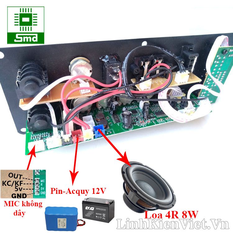 -- Mạch loa kéo 8622 12V 120W + 2 Mic không dây đa chức năng gồm phát nhạc từ USB, thẻ nhớ (đầu đọc thẻ được tặng kèm), Phát FM, AUX, Bluetooth, Hát Karaoke,...