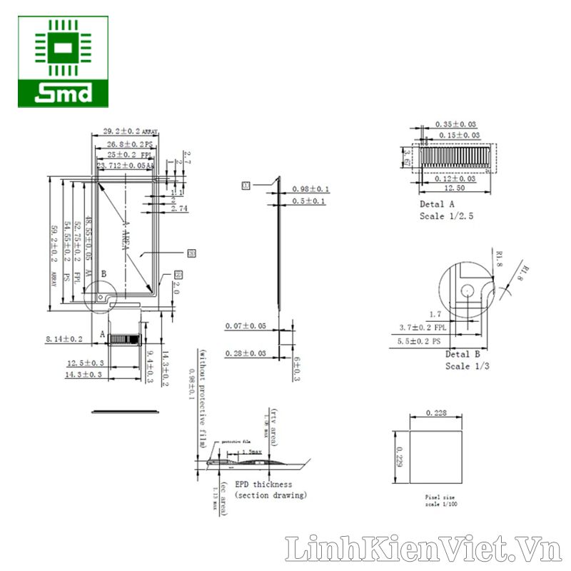 - Outline kích thước: 29.2mm × 59.2mm × 0.98mm