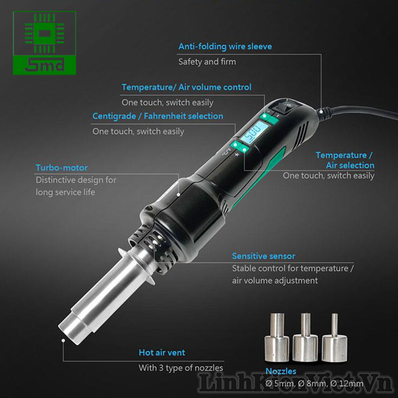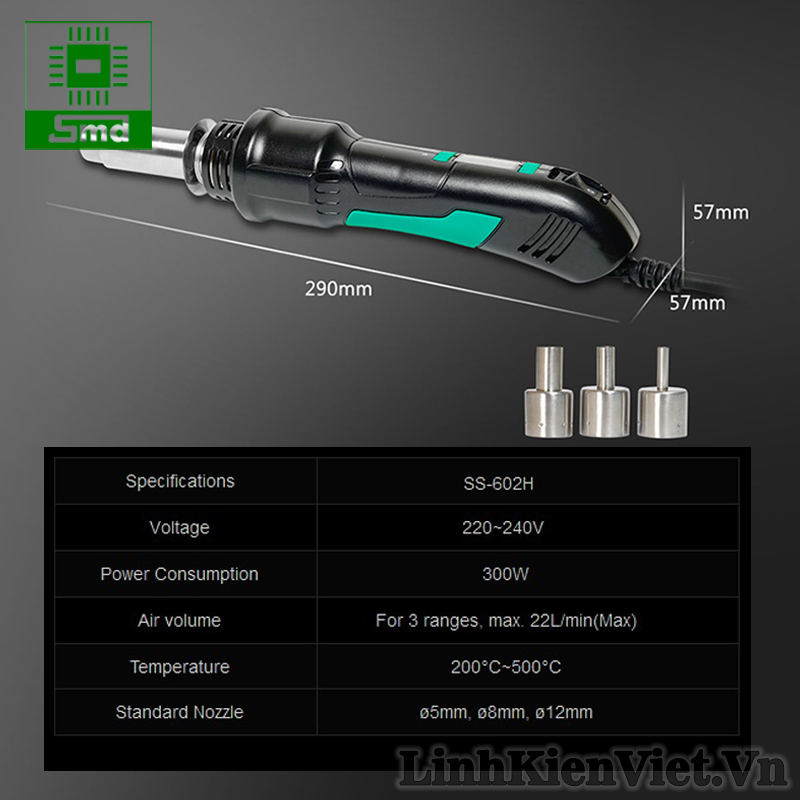 Máy khò cầm tay Pro'sKit SS-602H Chỉnh nhiệt hiển thị nhiệt độ LCD, Máy khò tháo linh kiện điện tử dán SMD 220V 300W