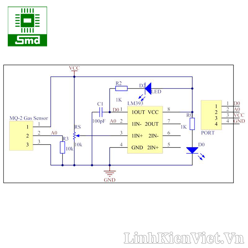 + Dựa vào việc điều chỉnh biến trở để thay đổi điện áp tham chiếu của LM358 chúng ta có thể điều chỉnh độ nhạy của MQ2 .Mình thường để ở khoảng 1.5V – 2 V .