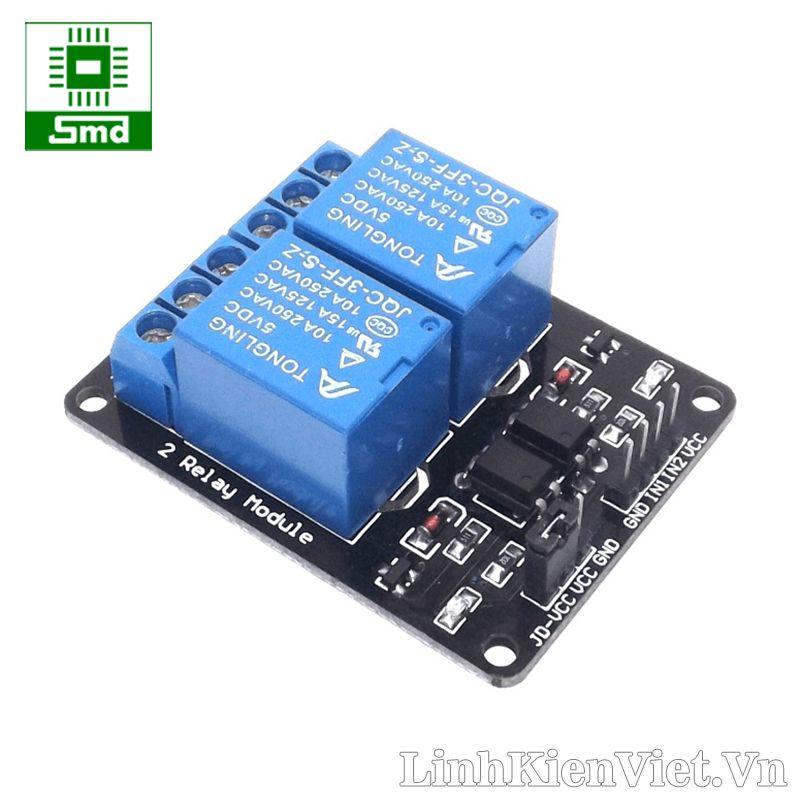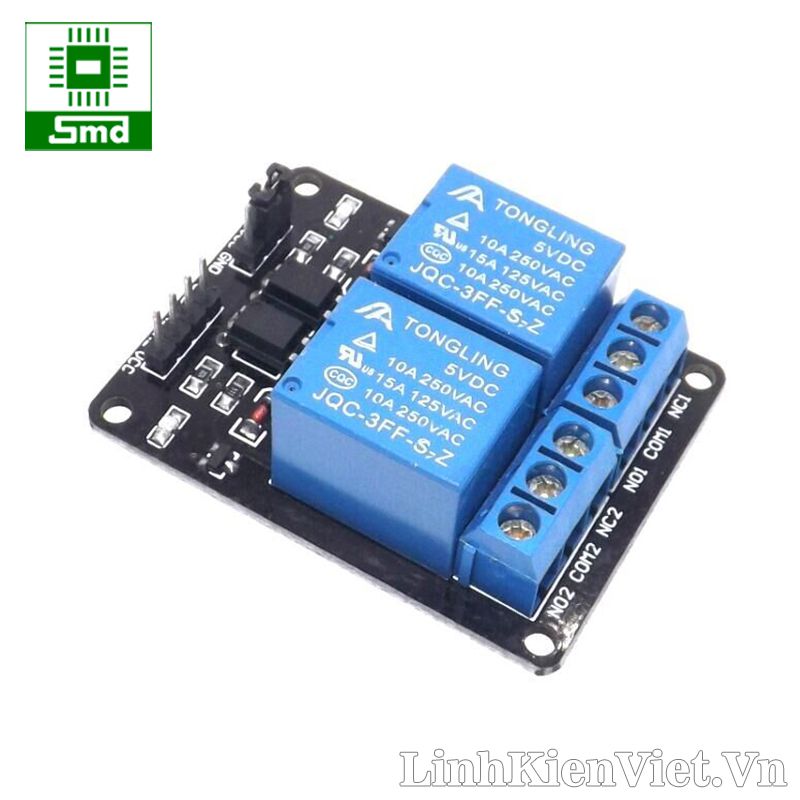 - Module 2 relay với opto cách ly bao gồm 2 relay hoạt động tại điện áp 5VDC, có khả năng chịu được hiệu điện thế lên đến 250VAC-10A, 30VDC-10A.