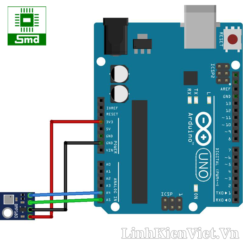 - Có thể sử dụng để đo độ cao vì áp suất sẽ thay đổi theo độ cao. Rất dễ sử dụng và dễ hàn trên bảng mạch in (PCB) với kích thước nhỏ và tiêu thụ ít điện năng. Nếu sử dụng để cảm biến nhiệt độ thì BMP180 là sự lựa chọn hoàn hảo. Có sẵn trên thị trường hoặc cửa hàng trực tuyến. Dưới đây là hình cảm biến áp suấtkhí quyển BMP180