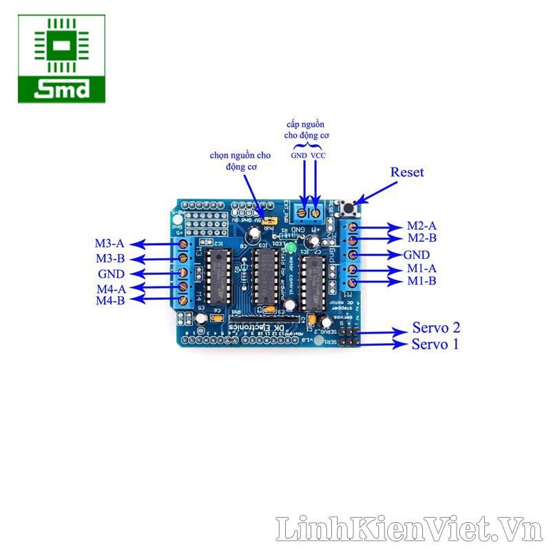 - Đầu ra: 4 đầu ra điều khiển 4 động cơ DC