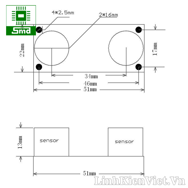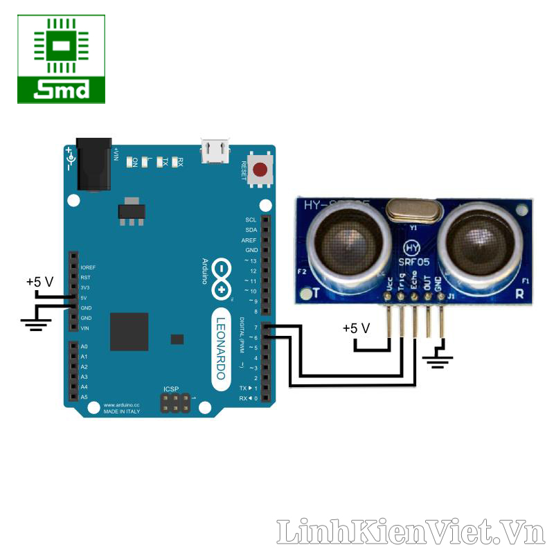 - Module HC- SRF-05 dùng để đo khoảng cách đến vật chắn bằng sóng siêu âm. Module có 2 đầu thu và phát sóng, khoảng cách được xác định bằng cách đo khoảng thời gian mà sóng siêu âm được phát ra từ module truyền đến vật chắn rồi phản hồi về. Sử dụng bằng cách truyền 1 xung vào chân trigger của module, sau đó chờ 1 xung trả về trên chân echo, độ dài của xung phản hồi tương ứng với thời gian của sóng siêu âm truyền trong không khí, từ đó tính ra được khoảng cách đến vật thể chắn. Module SRF05 được nâng cấp thêm từ SRF04: khoảng cách xa hơn 1m, thêm 1 chế độ hoạt động. Khi giữ chân Mode trên module xuống mass, SRF05 sẽ sử dụng chung 1 chân cho cả trigger và echo để có thể tiết kiệm chân cho vi điều khiển, đồng thời thêm vào 1 khoảng delay nhỏ để hỗ trợ cho những vi điều khiển cũ. Khi chân Mode không nối thì SRF05 sẽ hoạt động giống như SRF04, với 2 chân riêng biệt cho trigger và echo.