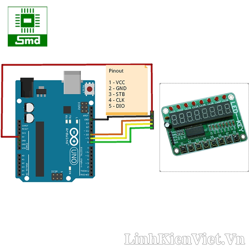 1. Dùng để tạo bảng điều khiển, hiển thị trên led đơn, led 7 đoạn và phím bấm thông qua giao tiếp nối tiếp sử dụng IC TM1638.