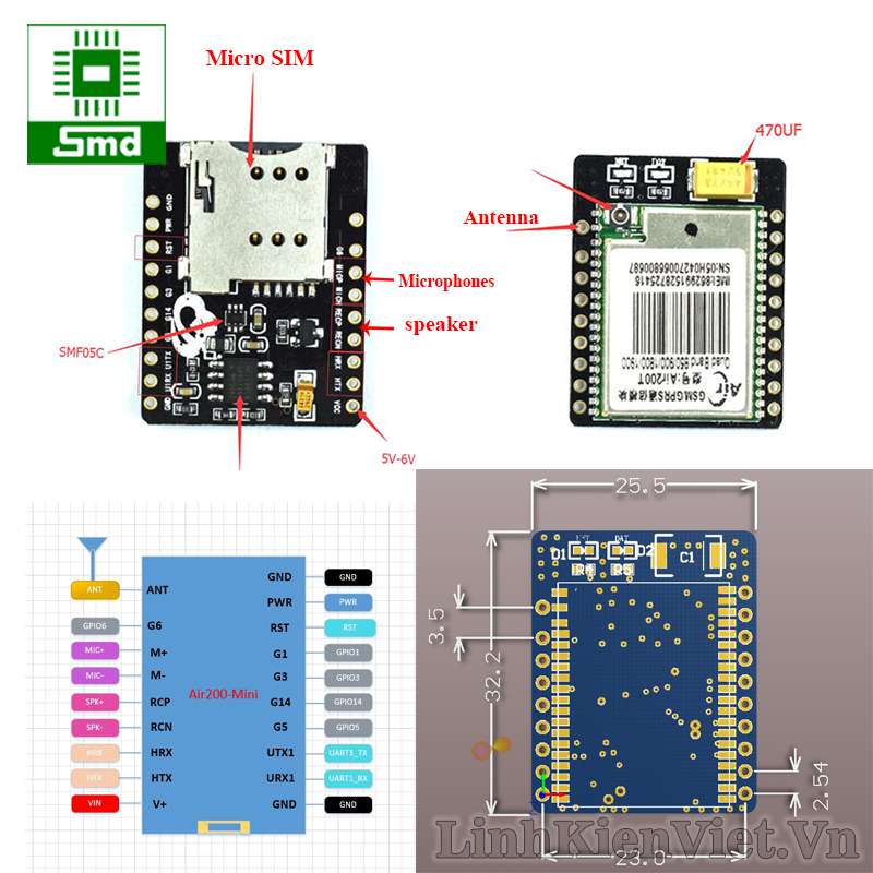 - Module Sim Air200 Quad-band GSM GPRS Luat STM32 microSIM