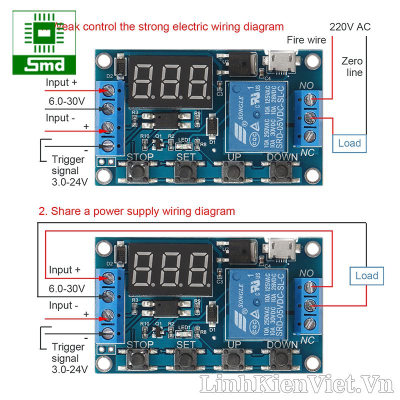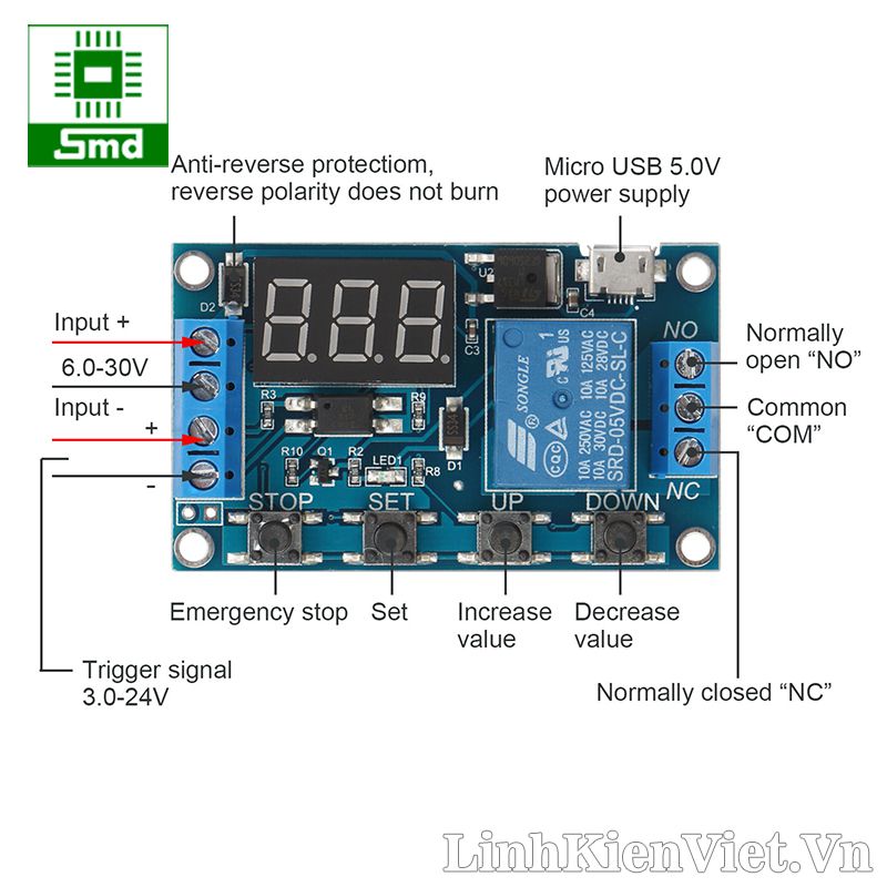 - Điện áp: 6-30V, hỗ trợ cấp nguồn micro USB 5.0V