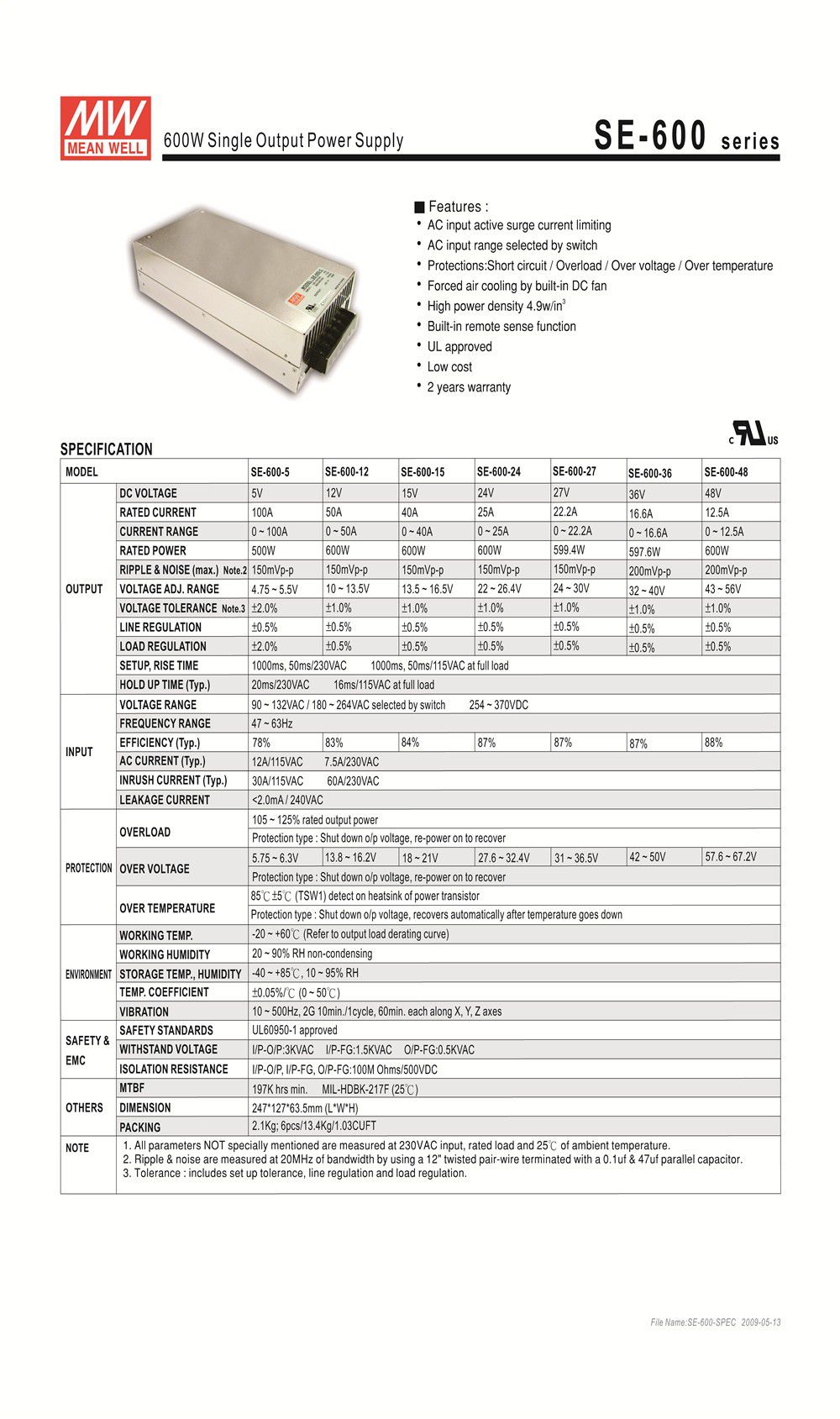 Nguồn Meanwell 12V 50A SE-600-12 (Đặt hàng)