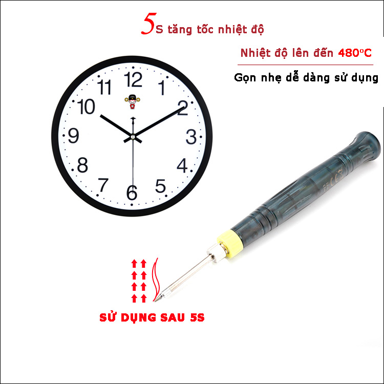 Tay hàn làm nóng cực nhanh chỉ dưới 13s khi bật nguồn và cũng hạ nhiệt nhanh chóng sau 30s tắt nguồn.