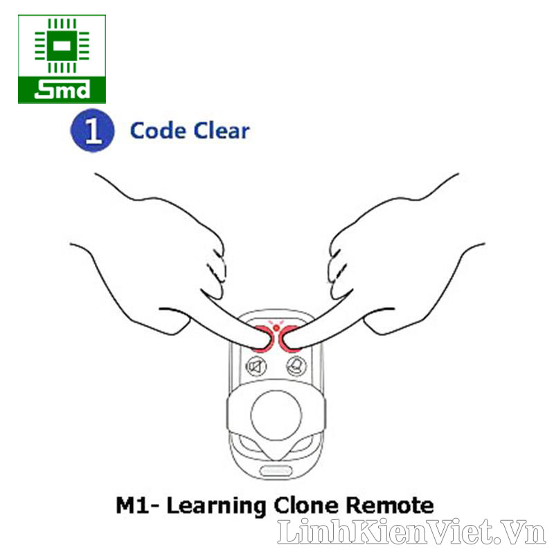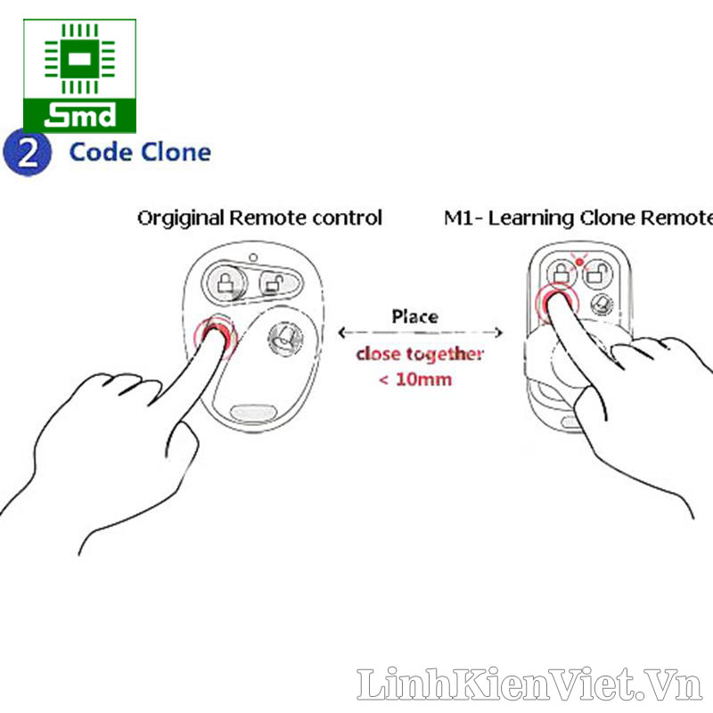 Đặt remote gốc và remote clone gần với nhau (<10mm), cùng lúc bấm và giữ một nút trên remote gốc và nút trên remote mà bạn muốn lập trình. Sau khoảng 3s, LED chỉ thị sẽ liên tục nhấp nháy nhanh để chỉ thị rằng việc sao chép nút bấm đó thành công.